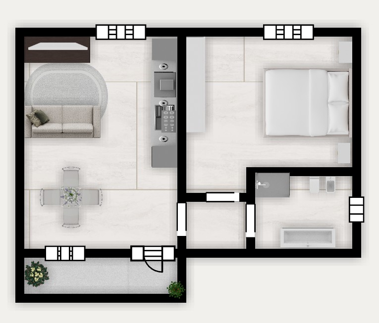 In posizione strategica e con tutti i servizi, proponiamo in palazzina di sei unità, appartamento posto al primo piano e libero su tre lati, composto da ampio soggiorno con angolo cottura con balcone, camera da letto e bagno.